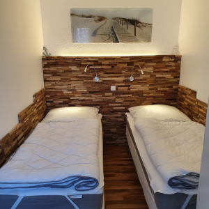 Das angrenzende Schlafzimmer ist eine Oase der Ruhe und des Komforts. Die zwei hochwertigen Boxspring-Einzelbetten, die sich bei Bedarf zu einem großzügigen Doppelbett zusammenschieben lassen, garantieren erholsame Nächte nach aktiven Urlaubstagen. Der geräumige Kleiderschrank bietet ausreichend Platz für Ihre Garderobe – von der Strandkleidung bis zur eleganten Abendgarderobe für einen Besuch in einem der exquisiten Restaurants der Insel.